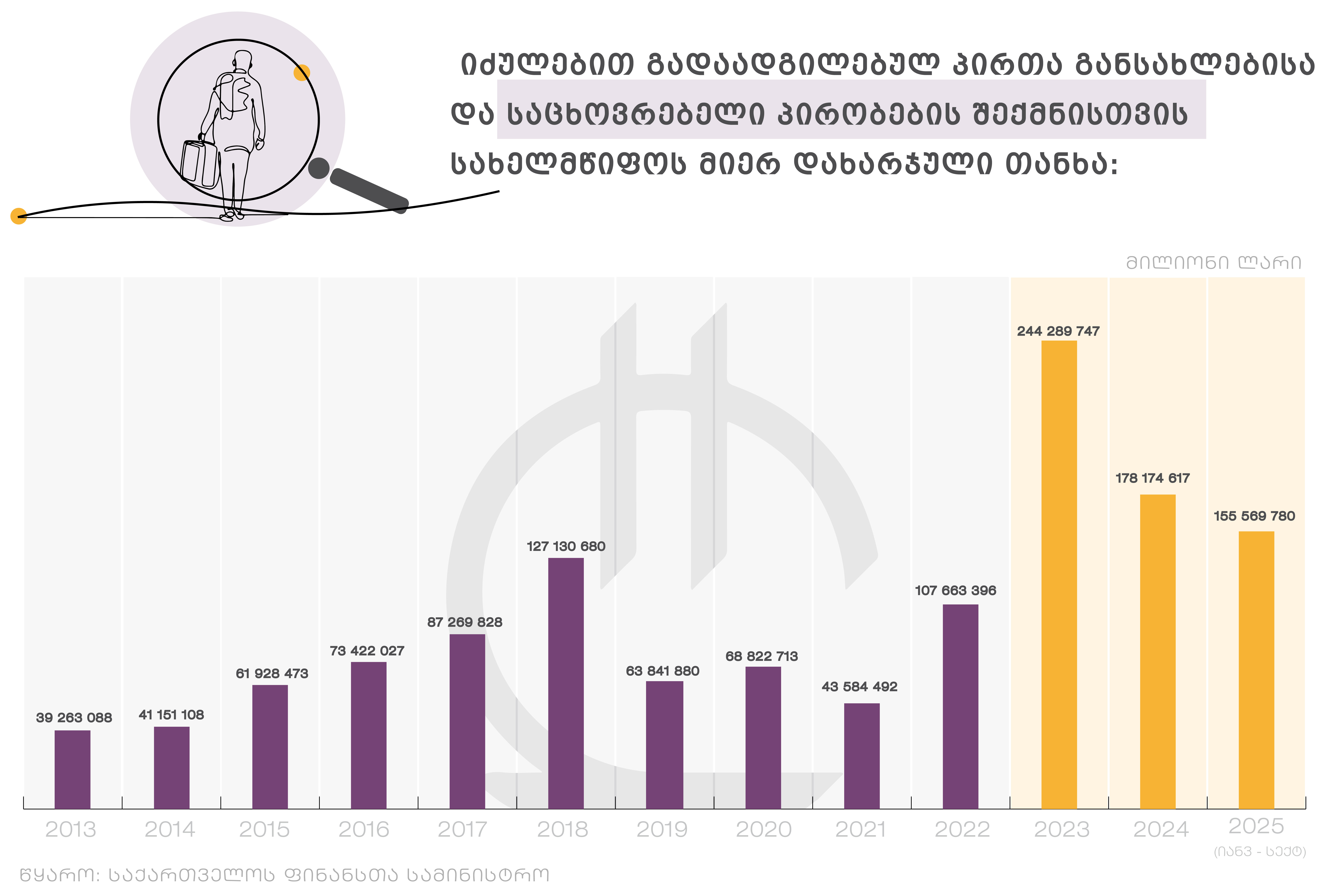 სახალხო დამცველის 2024 წლის ანგარიშის მიხედვით, საქართველოში 299 172 იძულებით გადაადგილებული პირი და 96 130 დევნილი ოჯახია რეგისტრირებული. მათგან 48 640 ოჯახი გრძელვადიანად არის განსახლებული, 43 792 ოჯახს კი გრძელვადიანი განსახლების სხვადასხვა პროგრამის ფარგლებში შევსებული აქვს განაცხადი საცხოვრებლით უზრუნველყოფის მოთხოვნით. ხოლო 385 ოჯახზე გაცემულია ადმინისტრაციული დაპირება, პირველივე შესაძლებლობისთანავე საცხოვრებლით უზრუნველყოფის თაობაზე.