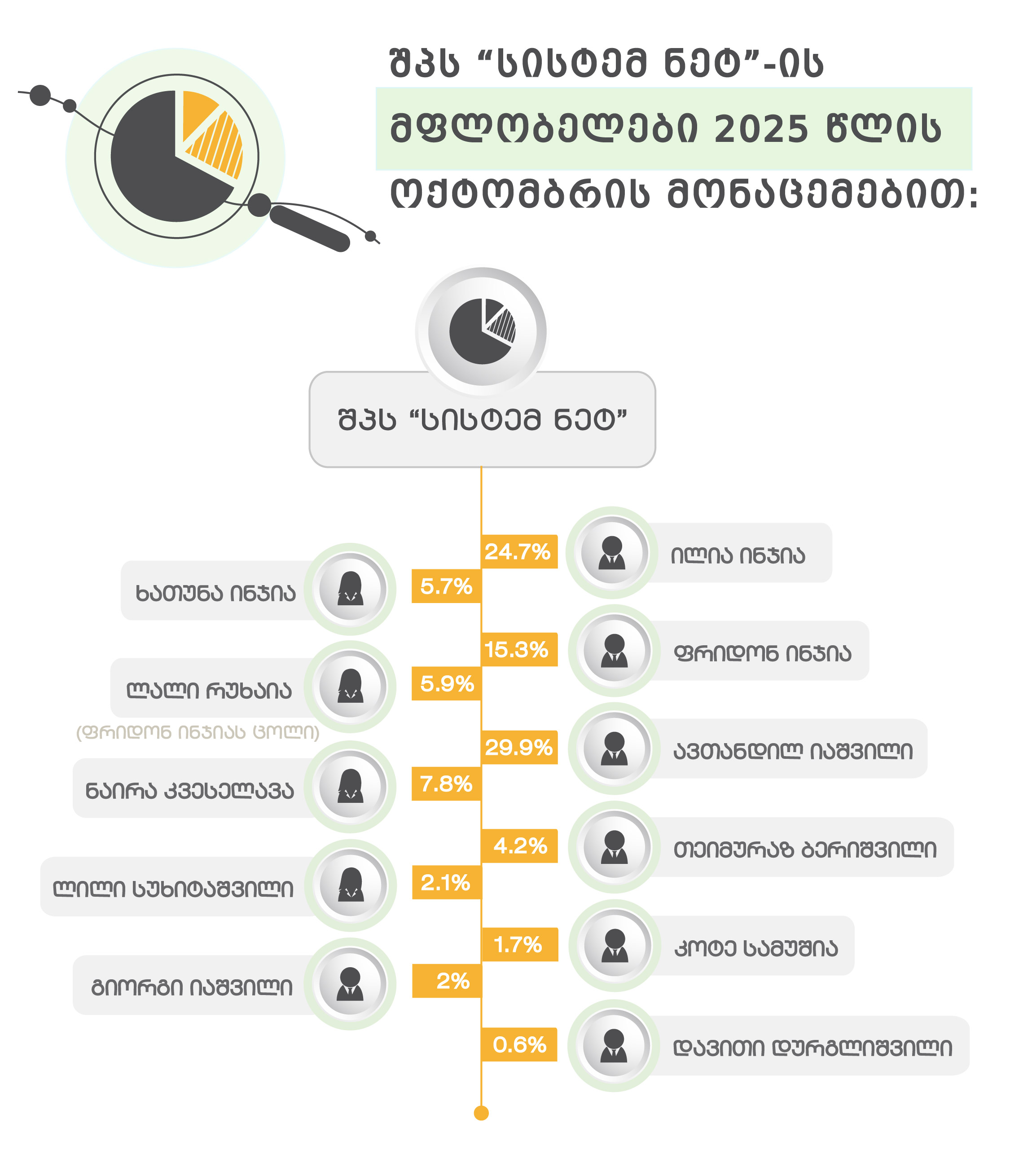 შპს „სისტემ ნეტი“ 2008 წელს დაფუძნდა და მეწილეები წელიწადში 3-ჯერაც შეუცვლია. თუმცა, არ შეცვლილა 2 მეწილე, რომელიც დაფუძნებისას ჯამში ყველაზე მეტ პროცენტს ფლობდა: ილია ინჯია (15.318%) და ფრიდონ ინჯია (21.565%).