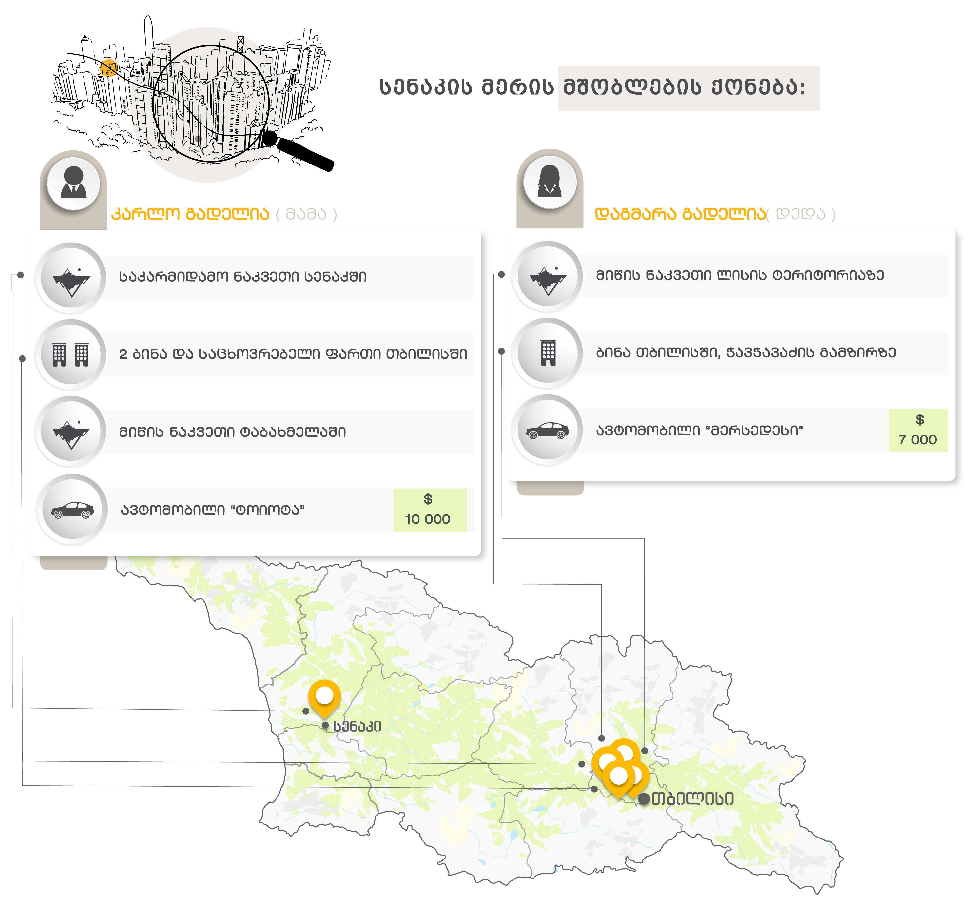 ახლა კი, საჯარო რეესტრის მიხედვით, კარლო და დაგმარა გადელიები ფლობენ საკარმიდამო მიწას სენაკში, საცხოვრებელ ფართს, 3 ბინას თბილისში, 2 მიწის ნაკვეთს ტაბახმელასა და ლისზე. მათგან ერთი 187 კვ.მ ფართობის მშენებარე ბინა მათ დემურ გადელიამ აჩუქა. 2023 წელს დაგმარამ 7 000 დოლარად იყიდა “Mercedes-Benz,” კარლომ - 2024 წელს 10 000-დოლარიანი “ტოიოტა.” როგორც დეკლარაციაში ვკითხულობთ, კარლო გადელია სს “არქეოპოლისის” სპეციალისტია და გასულ წელს იქ 15 000 ლარი გამოიმუშავა.