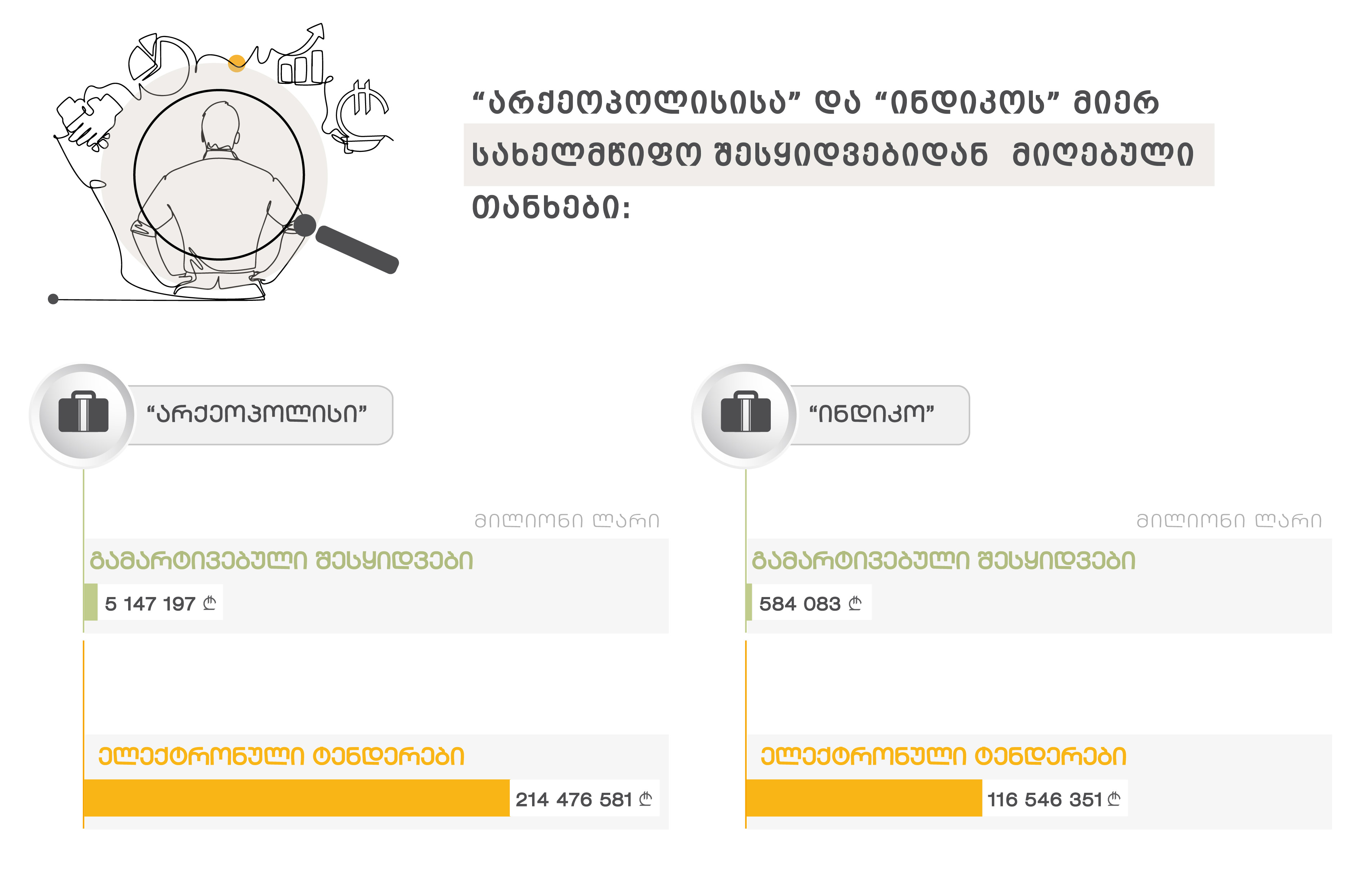 შესყიდვების ელექტრონული პორტალის მიხედვით, “არქეოპოლისი” ტენდერებში 2011 წლიდან მონაწილეობს და დღემდე 220 მილიონ ლარზე მეტი აქვს მიღებული (სახელმწიფო დაწესებულებებთან ხელშეკრულებებს ადრეც აფორმებდა, თუმცა რადგან სახელმწიფო შესყიდვები 2011 წლამდე საჯარო არ იყო). ამ სტატისტიკას მცირედით ჩამორჩება შპს “ინდიკო”, რომელსაც სახელმწიფო შესყიდვებიდან 2011-2025 წლებში 117 მილიონ ლარზე მეტი აქვს მიღებული (2025 წლის ოქტომბრის მდგომარეობით).